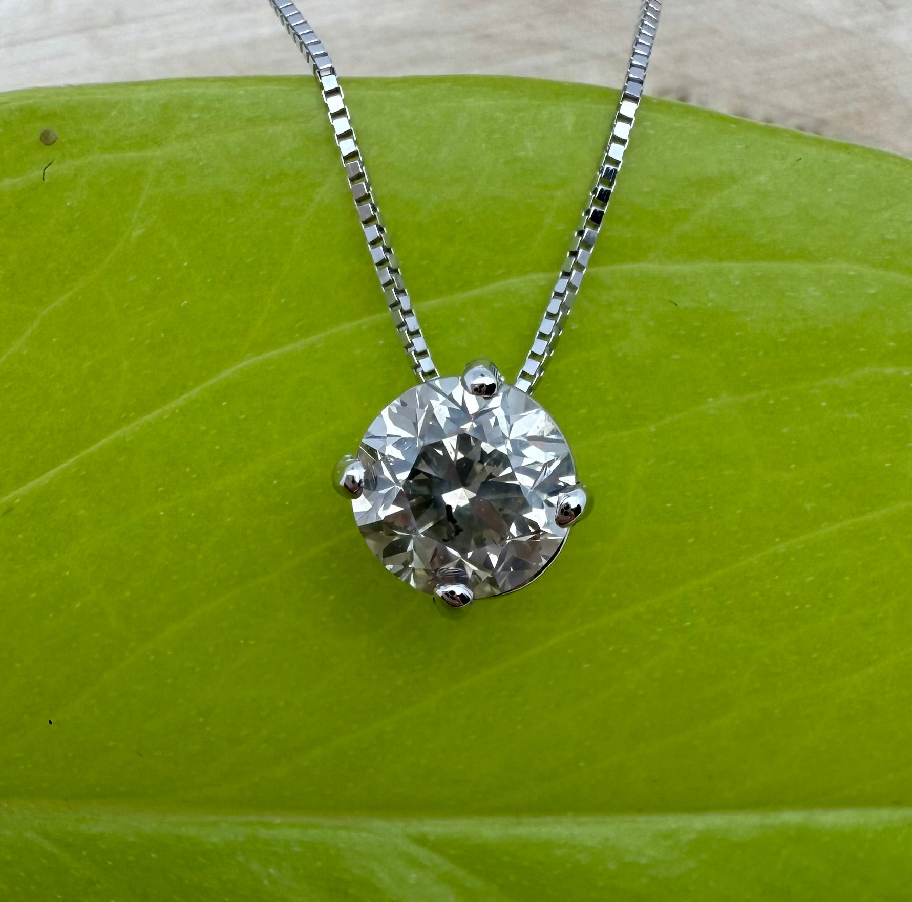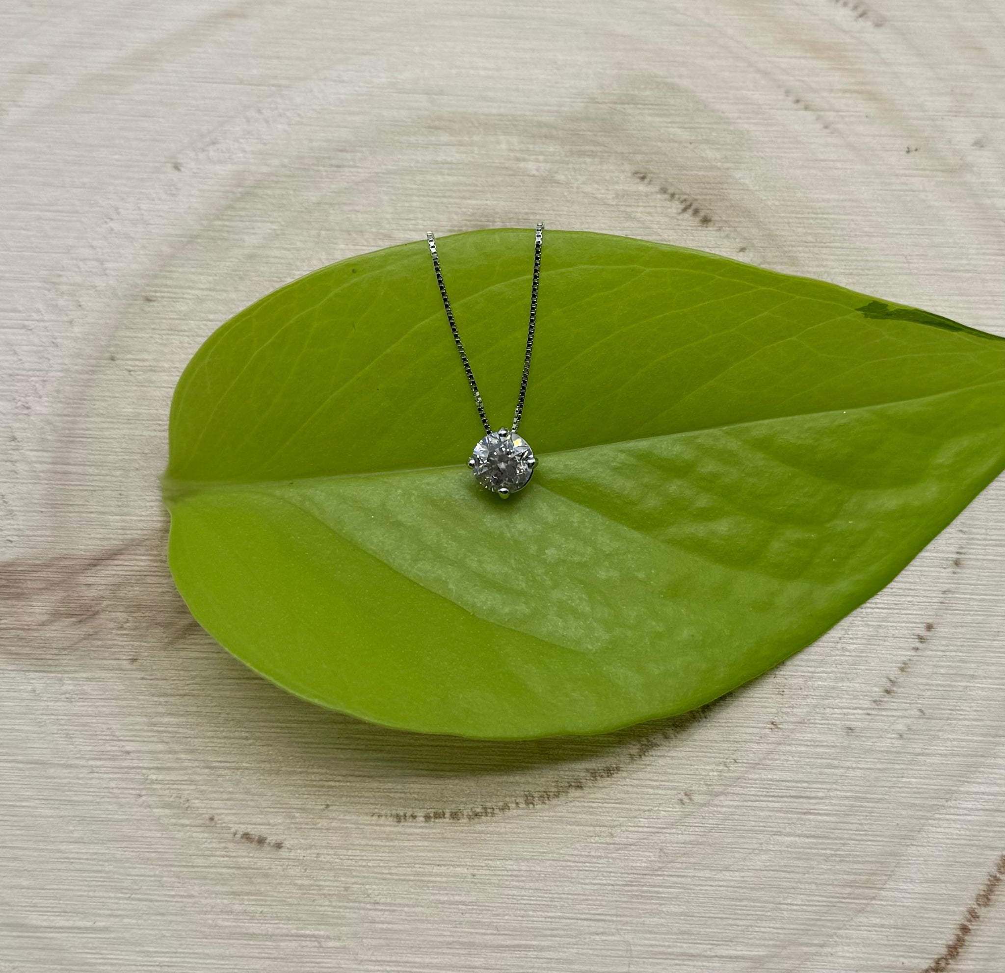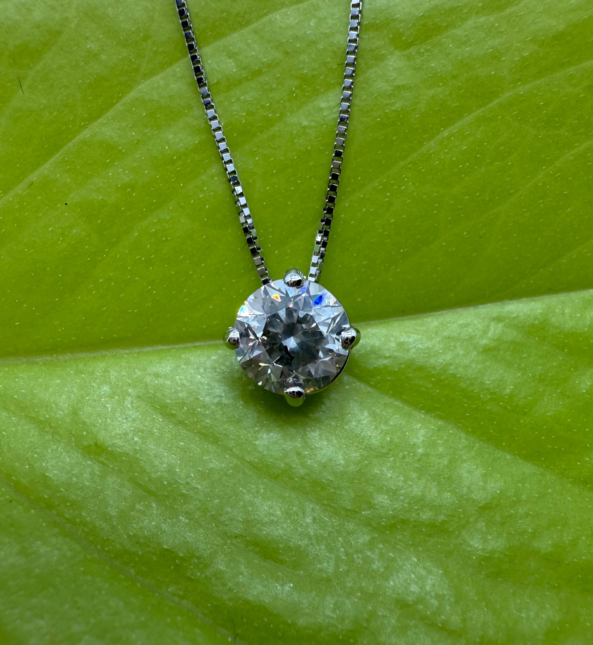 Simplicity, when it is best. A white gold chain and a big diamond weighing more than 1 carat. The diamond will change its appearance all the time according to the light. Sometimes it will look gray and other times it will light up in all colours of the rainbow.