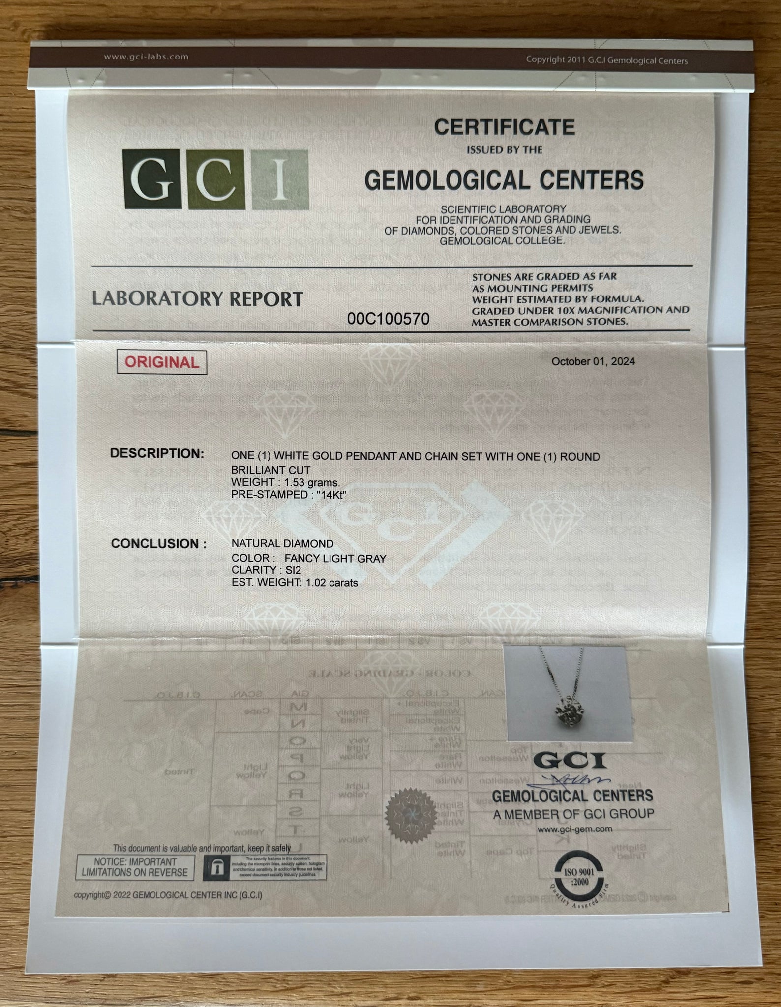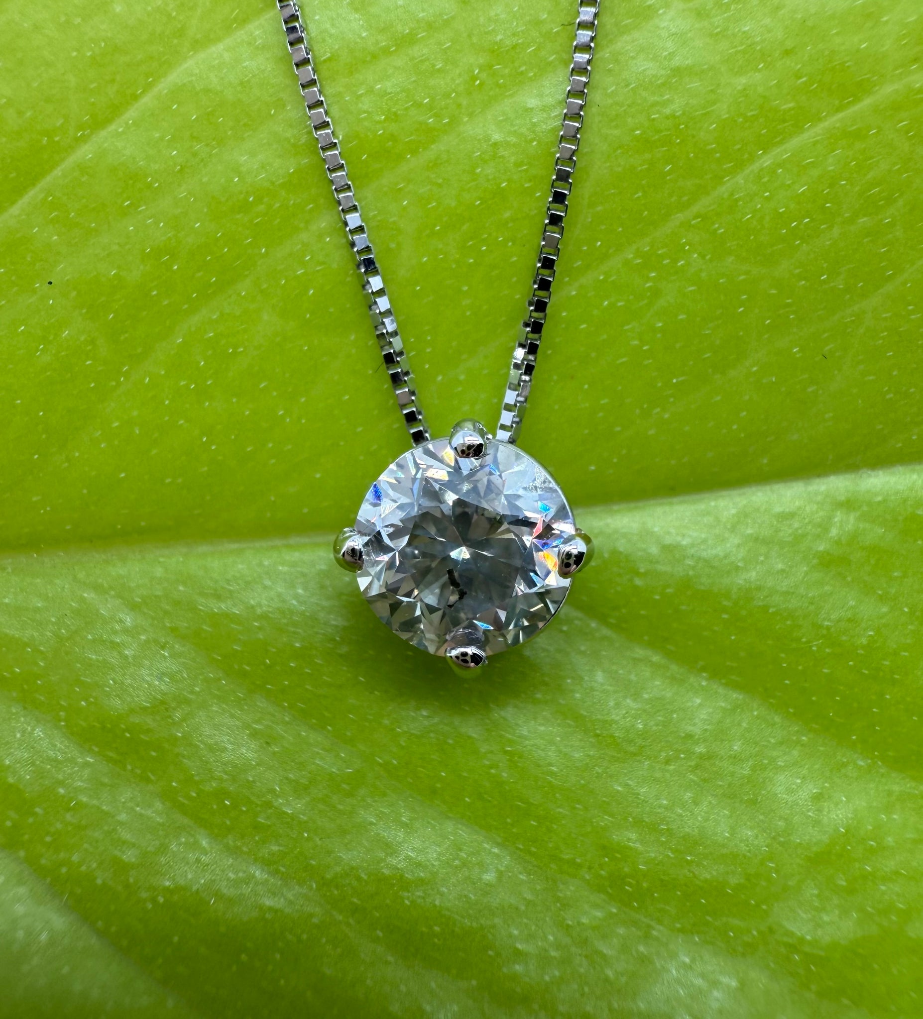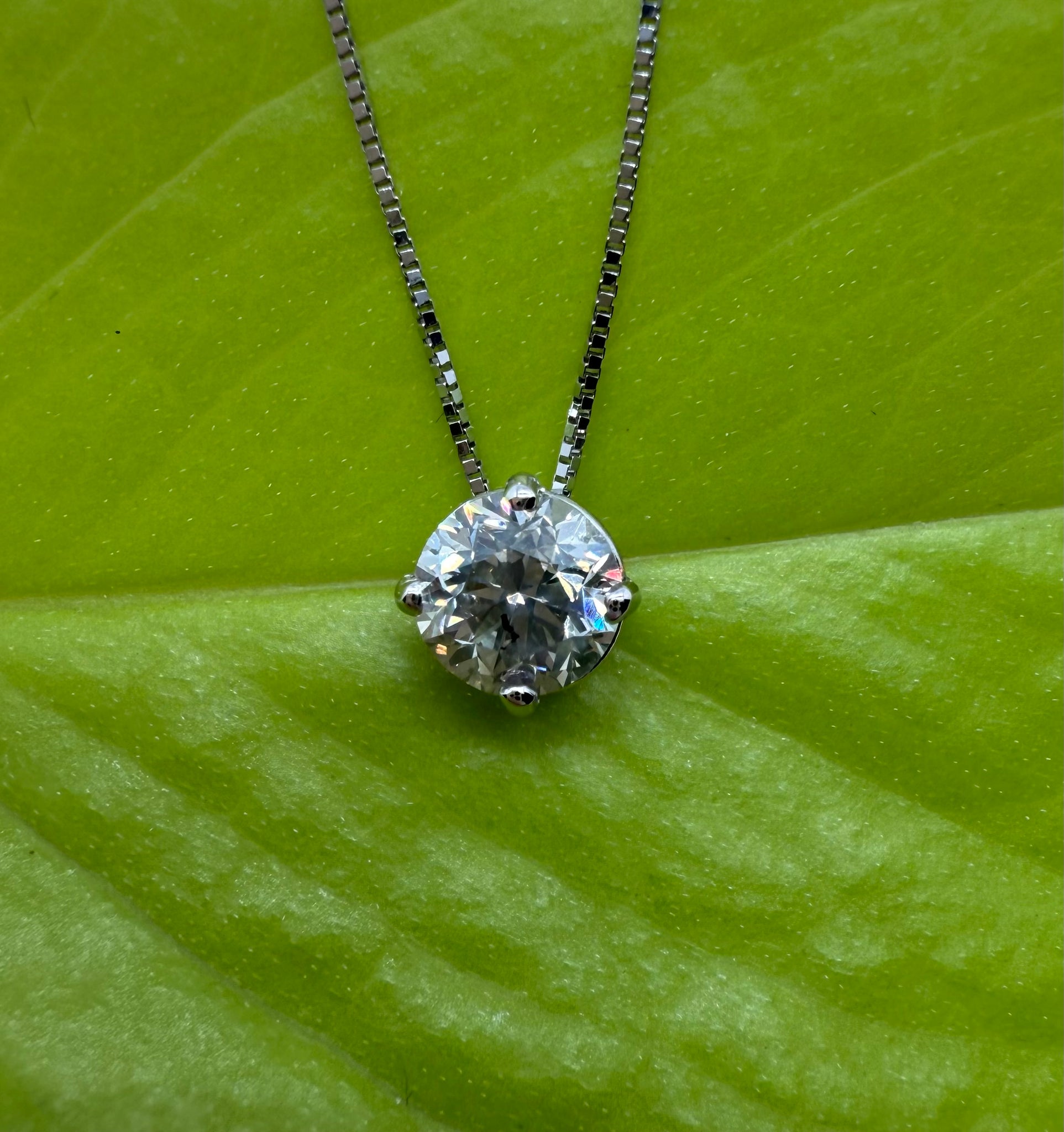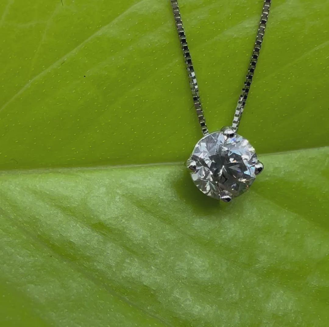 Simplicity, when it is best. A white gold chain and a big diamond weighing more than 1 carat. The diamond will change its appearance all the time according to the light. Sometimes it will look gray and other times it will light up in all colours of the rainbow.