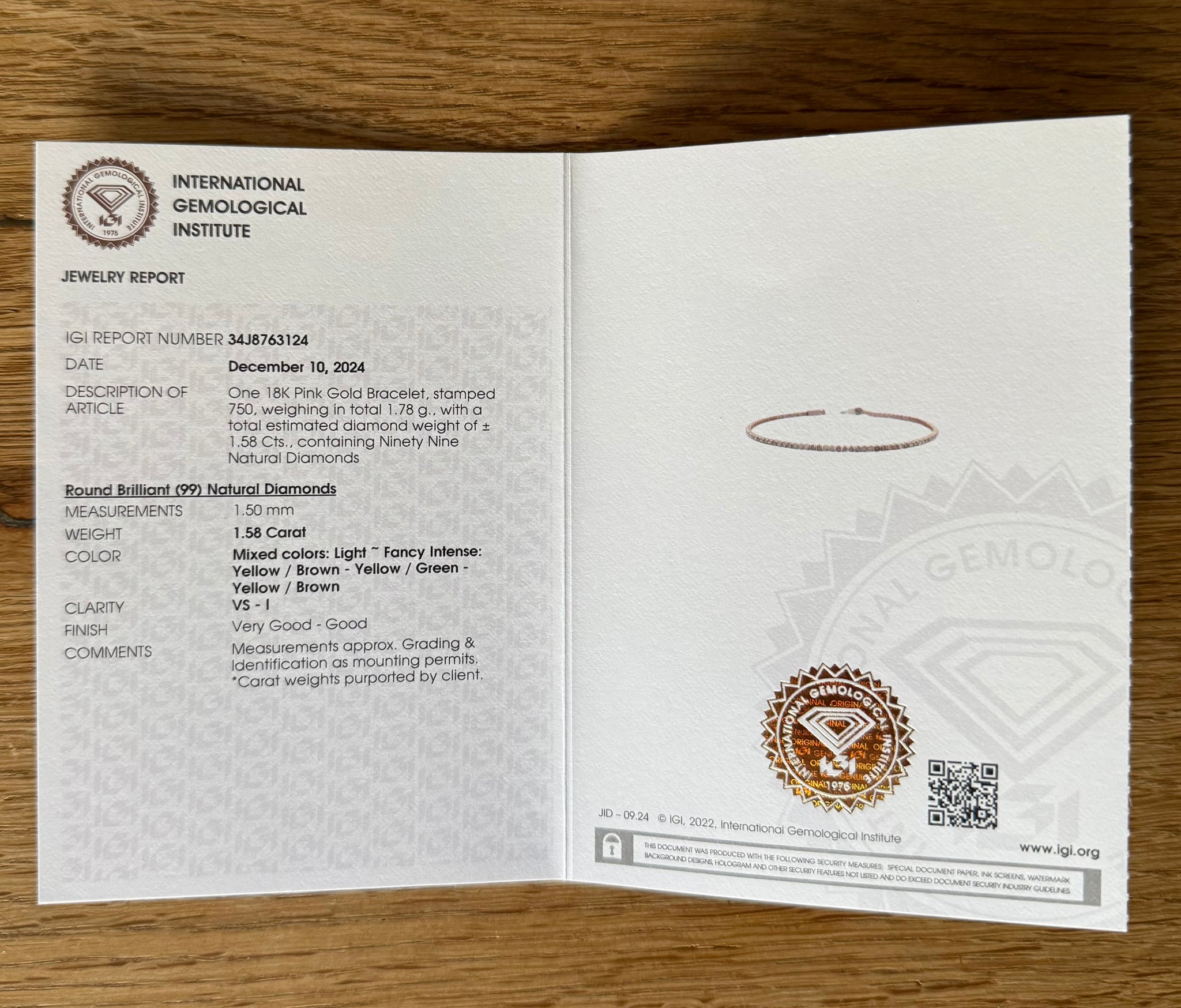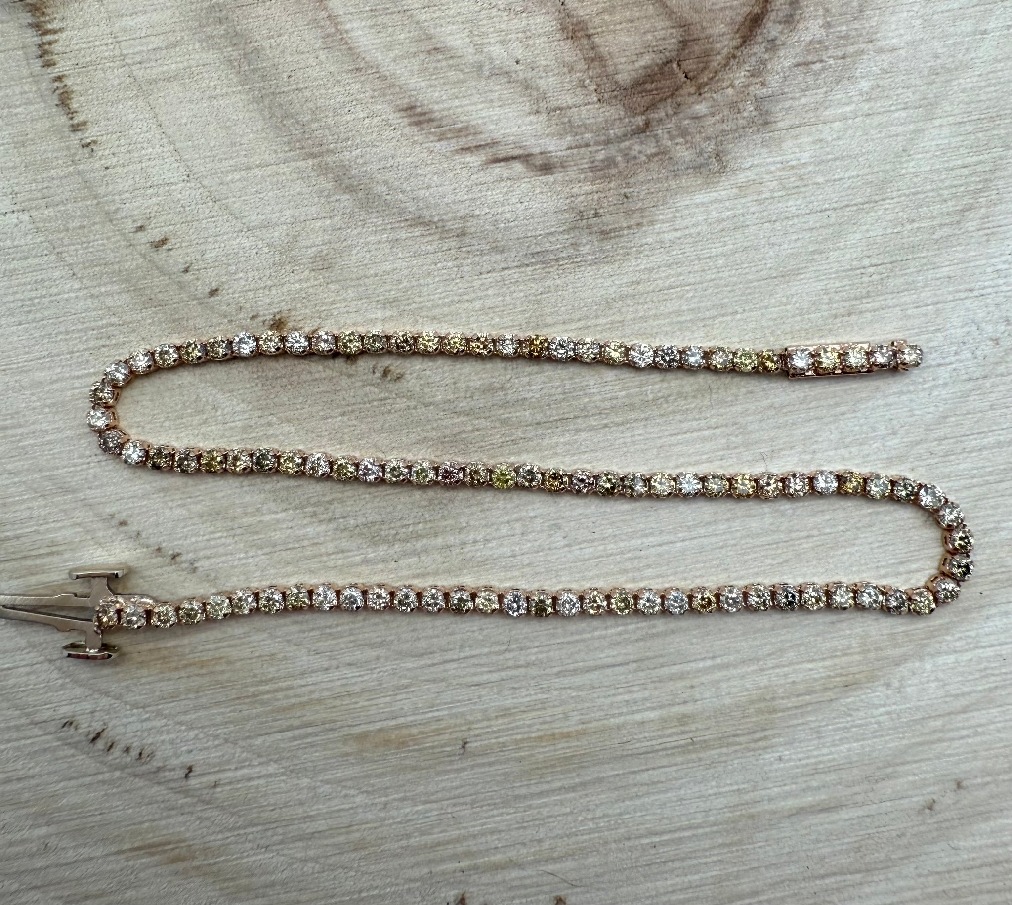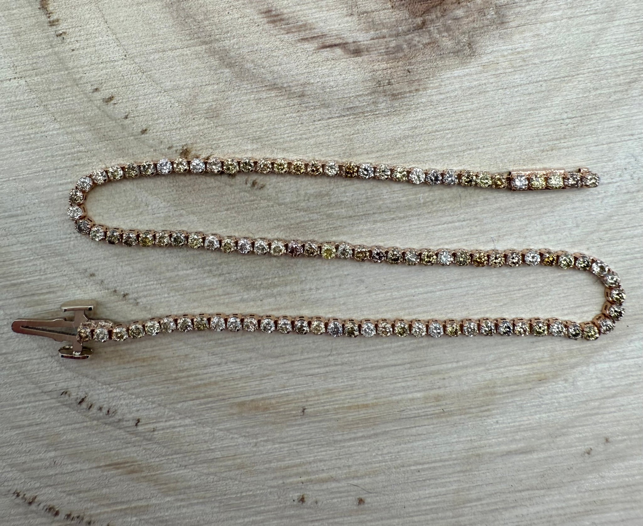 Tennis bracelets are extremely popular. This one in 18 ct. rose gold with 99 natural diamonds in different colors is definitely one that will make you stand out. It is not as shiny as the regular bracelets with colorless diamonds, but it has the perfect mix between some sparkle in the light and lots of interesting colors the closer you look.