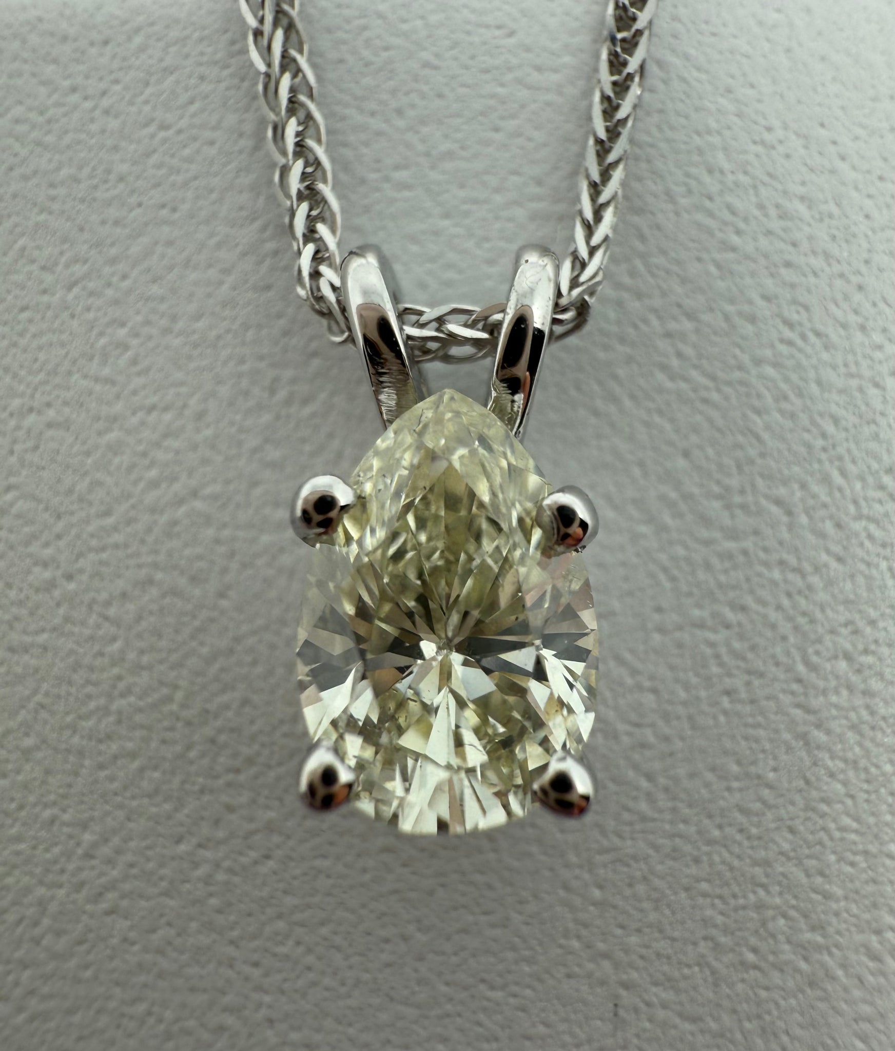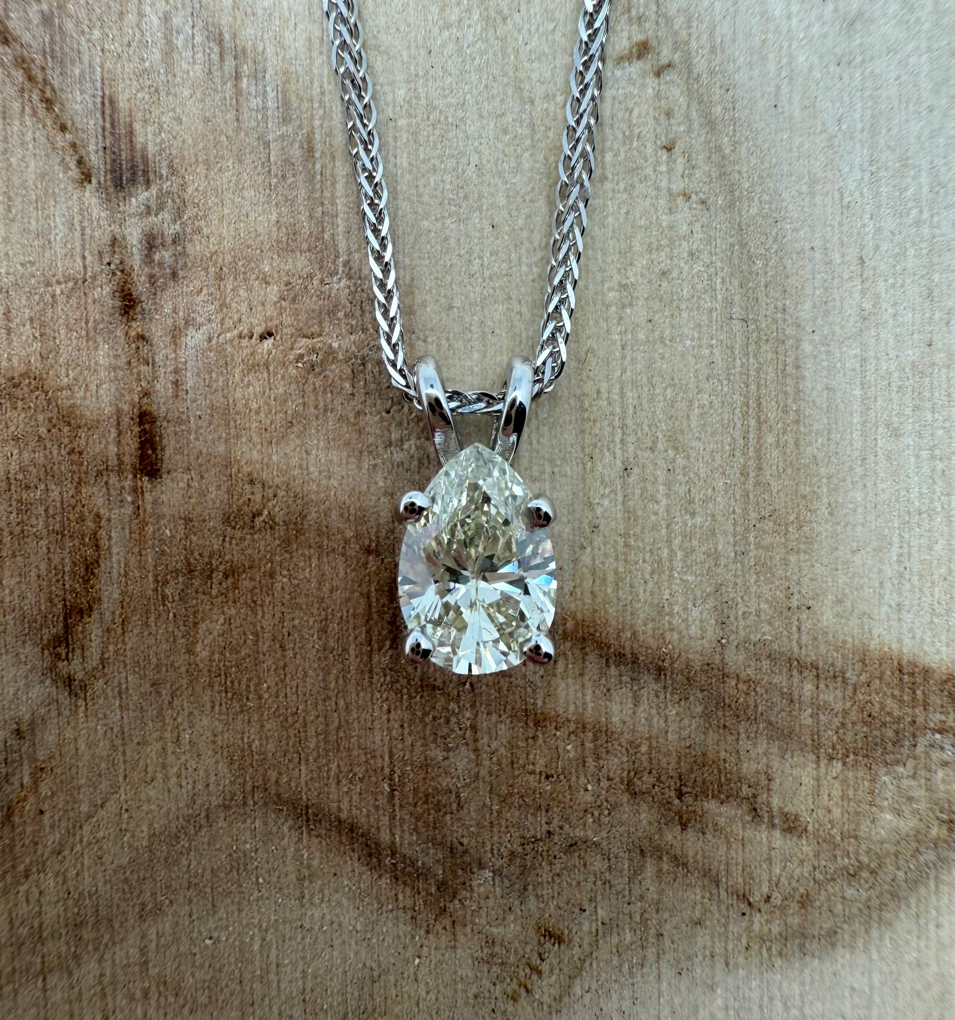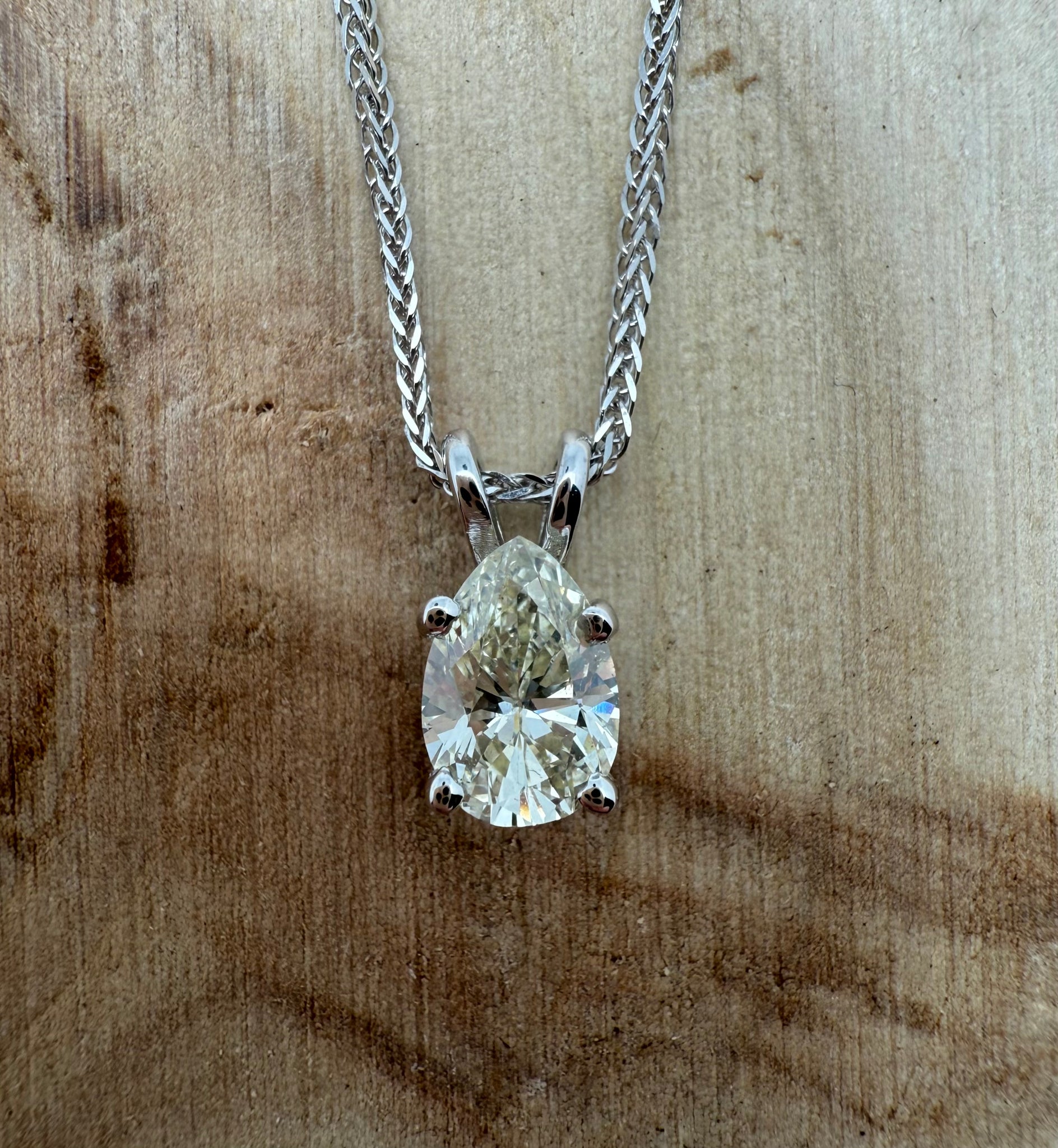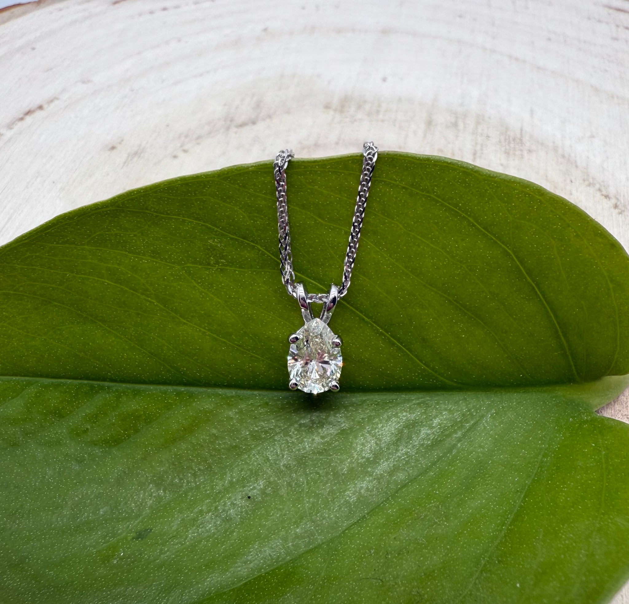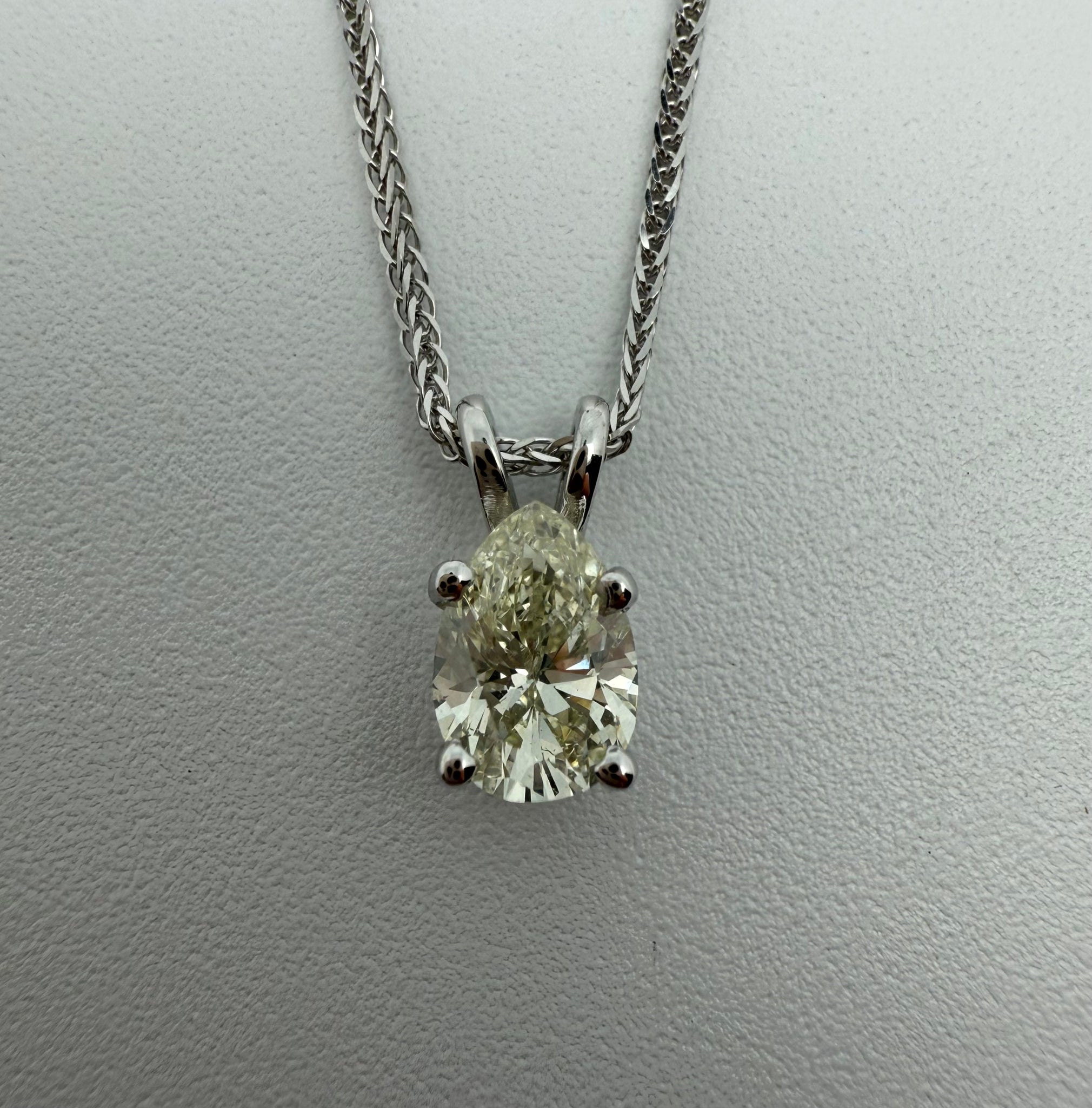 This exquisite piece of jewellery is a true testament to timeless elegance and refined craftsmanship. A delicate white gold chain gracefully supports a single, striking pear-shaped diamond of VS2 clarity. The diamond’s exceptional color, shifting subtly between luminous white and cold yellow under different lighting, adds a captivating dimension to its brilliance. Bold yet understated, this design allows the diamond to take center stage, making a sophisticated statement that is both modern and enduring.