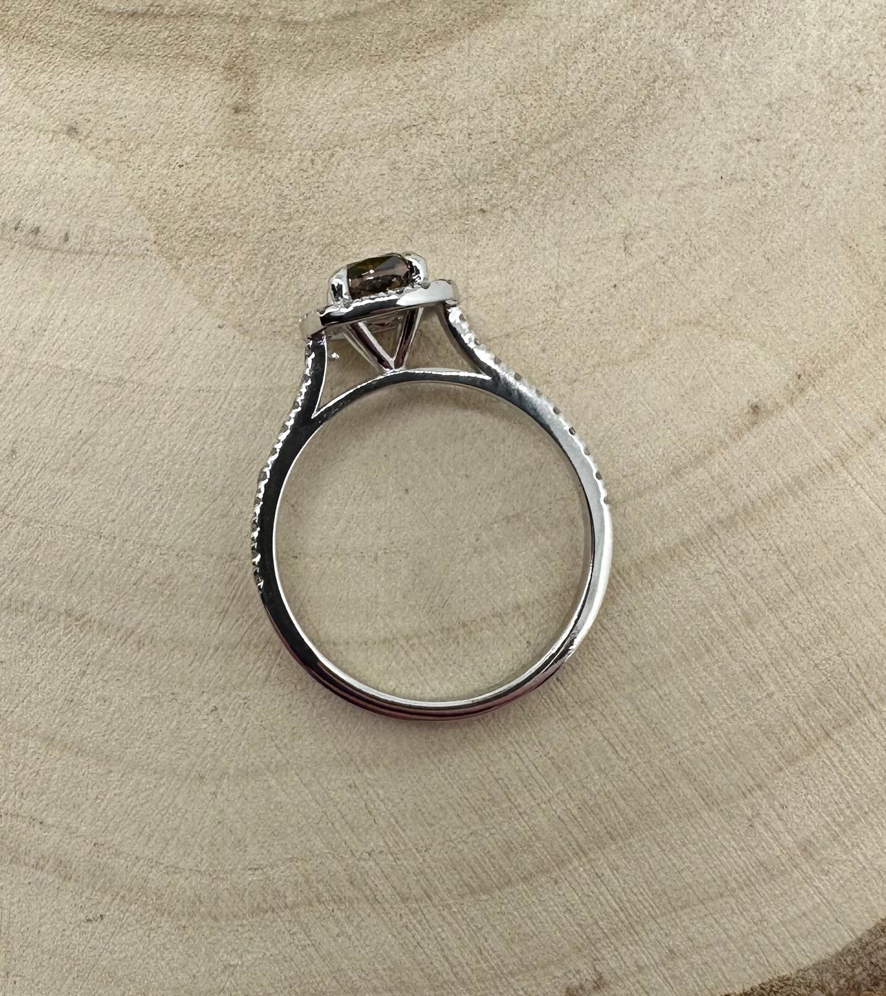 An amazing halo ring with a lot of sparkle. It draws attention, but the kind of attention you definitely want. A large and amazing diamond with so many deep and interesting colours in very high quality is not seen every day! You can look into it for hours and find new nuances and the small light pink diamonds around frame it fantastic.