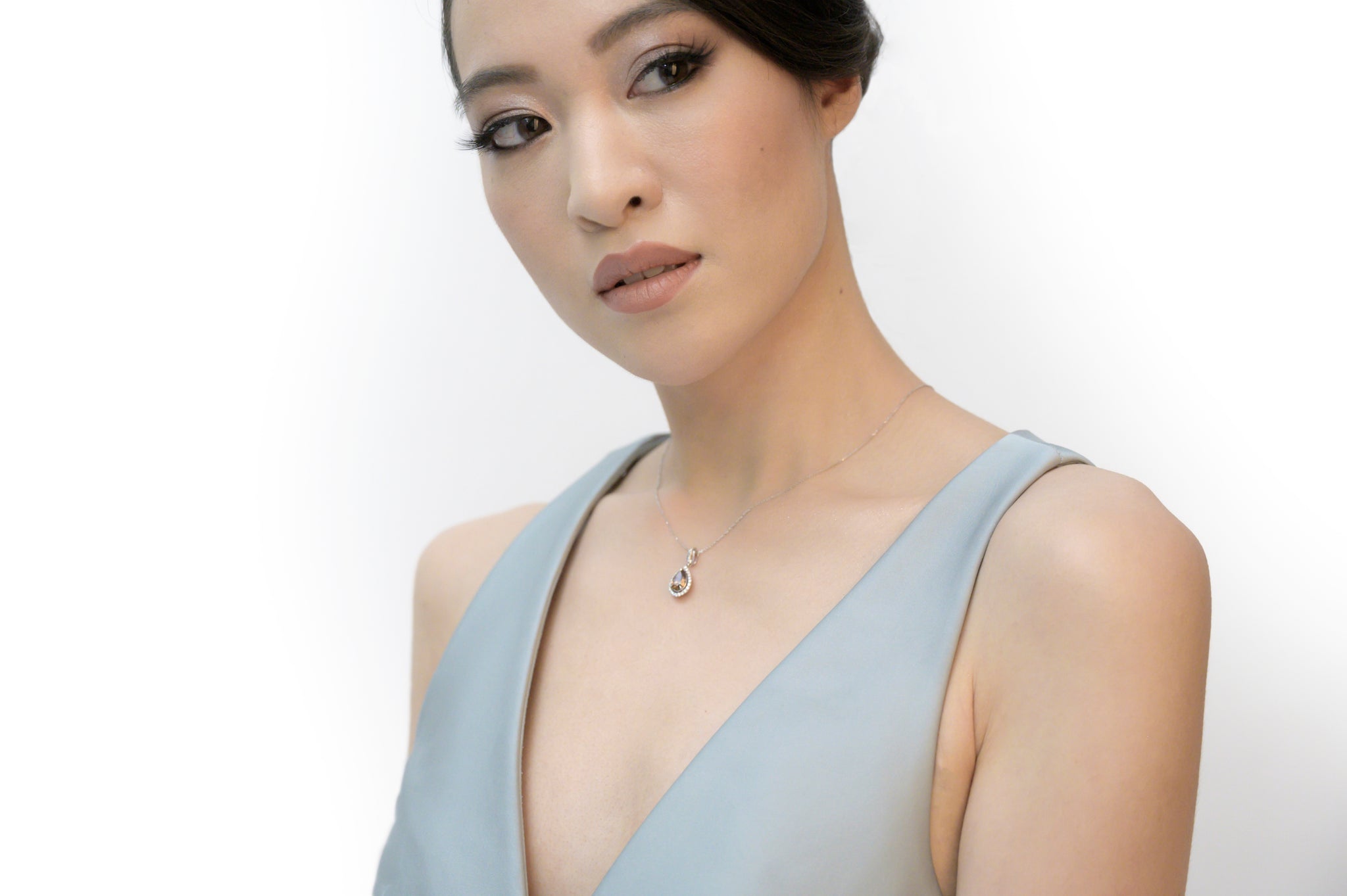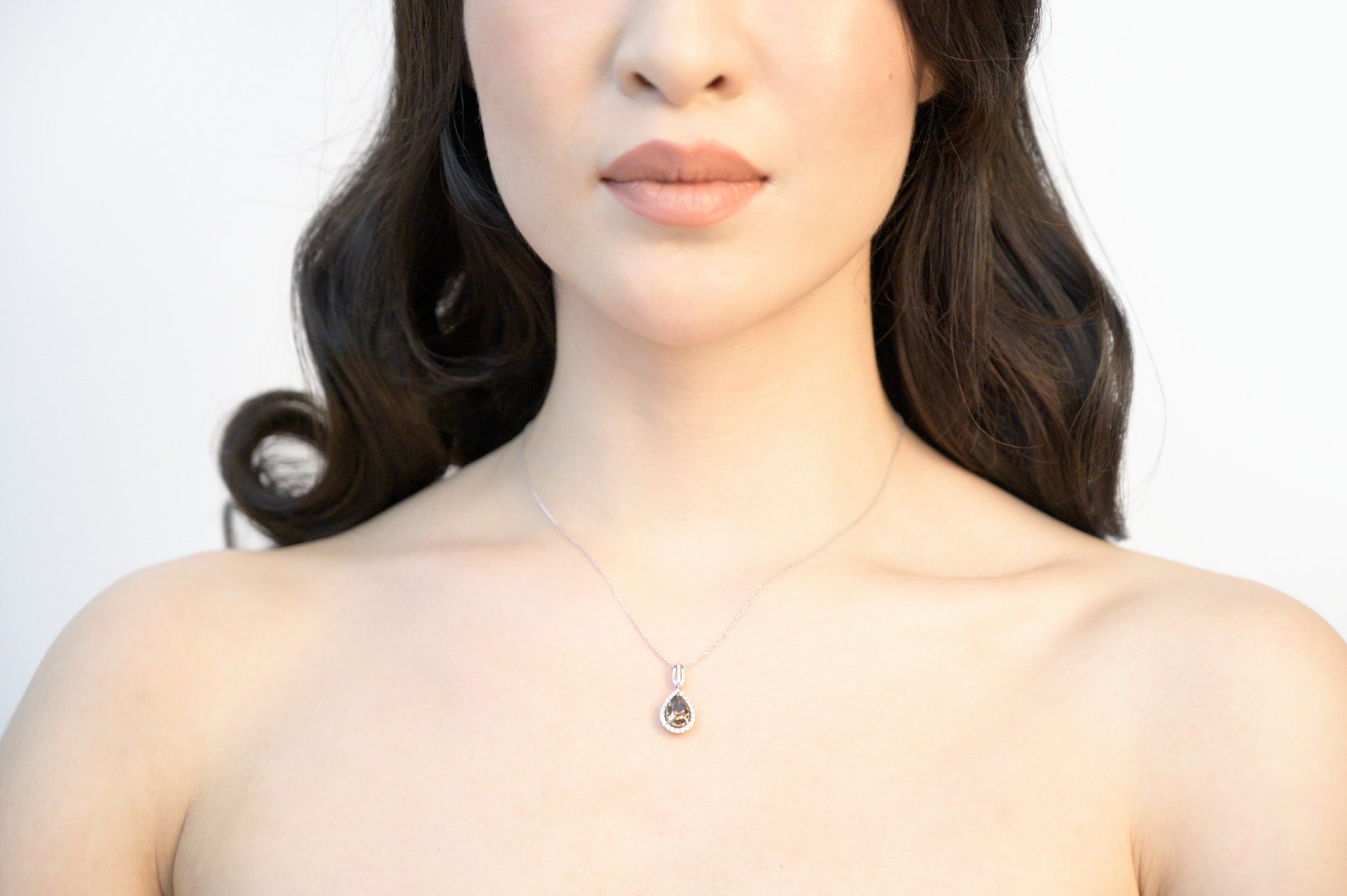A stunning masterpiece with a very big pear shaped natural coloured diamond with sparkling colourless diamonds around it. The thin white gold chain works perfectly with the large diamond and makes the piece uniquely elegant.